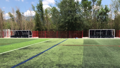 Banca para 14 jugadores, estructura de acero, techo de lona o policarbonato, medida largo 5 m, altura 1,80 m fondo 1,60 m