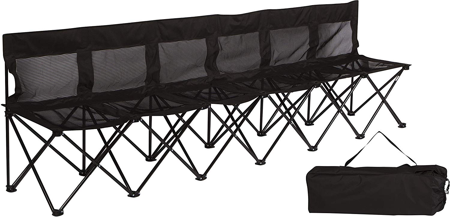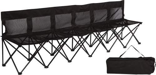 Este marco de acero resistente, duradero, ligero, y portátil para 6 personas. Banco Plegable con un asiento y respaldo de malla es perfecto para estar entado en la banda en un evento deportivo, tailgating, una fiesta, en el exterior de camping, o en cualquier lugar. Muy portátil y de peso ligero. NO requiere montaje, solo desembalar y ya está listo para usar. Artículo mide 100 pulgadas de largo, 18 pulgadas de fondo, y 18 pulgadas de alta cuando esta armada.