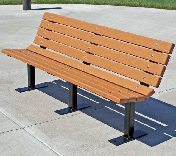 Banca para parque fabricada en plástico reciclable y soporte de acero, medida 1.60 m de largo x 40 cm fondo x 75 cm de altura con respaldo