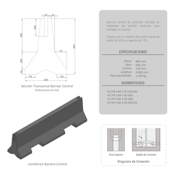 Buenas tardes. Estoy buscando barrera tipo New Jersey de concreto con una sección de 3.00 mts de longitud y 1.50 mts de altura, ¿la trabajan?. Quedo pendiente. Saludos cordiales.