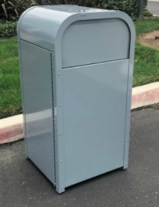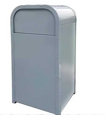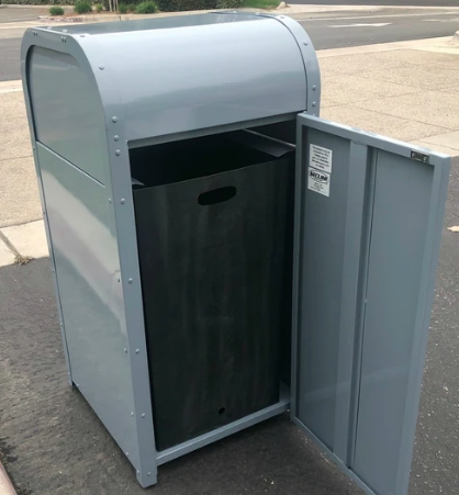 Botel de basura Tematico, fabricado en acero galvanizado, curvo, con puerta de acceso al bote de basura interno y compuerta estibable para introducir la basura, pintura el polvo polyester