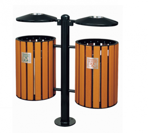 BOTE DOBLE DE BASURA CIRCULAR ECOLÓGICO, FABRICADO CON TABLONES DE PLASTIMADERA, Y ACERO, PEDESTAL TUBULAR 2" CÉDULA 30, TAPAS DE ACERO PLASTIFICADO, PINTURA ELECTRO ESTÁTICA,