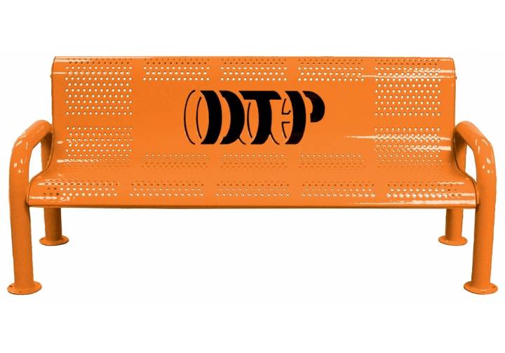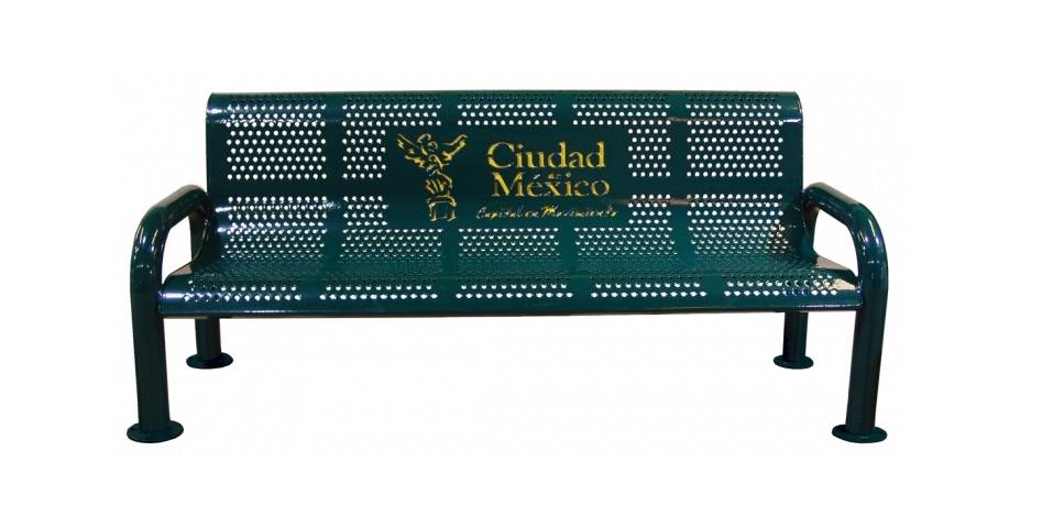 Banca de acero perforado, montado sobre estructura tubulas de acero, acabados de pintura electroestática