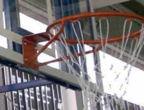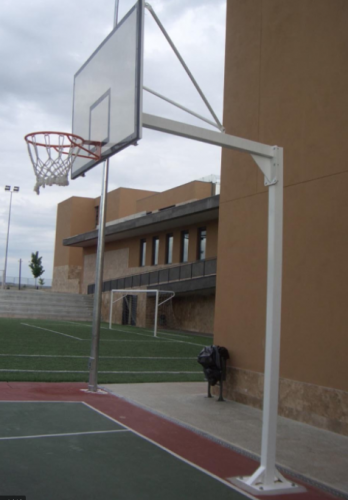 Canasta de baloncesto para instalación fija al suelo, compuesta por estructura monotubo pintada, acero de sección cuadrada de 100x100x3mm con base de placa preparada para anclar al suelo. Tablero de fibra de vidrio de grosor 20mm con bastidor metálico de perfil 50x20x2mm. Aro fijo fabricado en tubo de hierro macizo de 20mm con 12 puntos de fijación de red y red de hilo de algodón de 4,5mm.