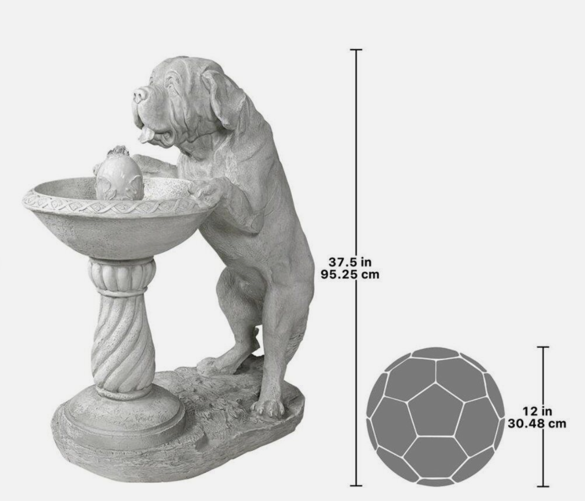 ¡Nuestro amigo canino no es el único que se sentirá atraído por la agradable melodía acuática de la música que burbujea desde el orbe central hacia el generoso lavabo de esta fuente de estilo europeo de más de un metro de altura! Nuestro adorable San Bernardo de gran tamaño es el primero en la fila de esta refrescante y distintiva adición al hogar o al jardín. Fundida en resina de diseño de calidad con un acabado de imitación de piedra, esta fuente espléndidamente esculpida es una inversión en arte de jardín. Bomba para interior/exterior con certificación UL.