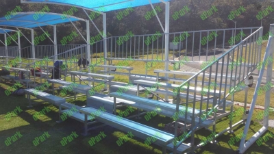 GRADA FABRICADA EN ALUMINIO ASIENTOS Y PISO, SOPORTES DE ACERO GALVANIZADO, ESCALERA DE 80 CM EN ALUMINIO CON PASAMANOS. NO INCLUYE TECHO DE MALLA SOMBRA.