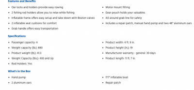 Completo con dos remos de aluminio de 48" y una bomba de mano manual, el juego de bote inflable INTEX™ Seahawk 4 11'7" viene con todo lo que necesitas para salir al agua. La embarcación cuenta con 2 cojines de asiento inflables para mayor comodidad. Dos portacañas de pesca ofrecen una fácil colocación de la caña para que puedas relajarte, mientras que la bolsa de equipo proporciona espacio de almacenamiento para tus pertenencias. La embarcación está diseñada con una línea de agarre alrededor de la embarcación para mayor seguridad y un asa de agarre para facilitar el transporte.