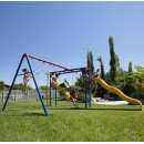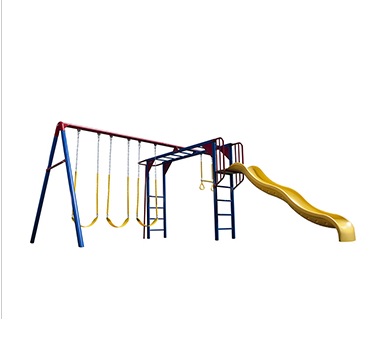 Este conjunto de columpios durable tiene 3 columpios de correa, 1 barra de trapecio, resbaladilla ondulada de 2.74m, pasa manos y un tubo de bomberos. Este modelo viene en tonos primarios (rojo, amarillo y azul).