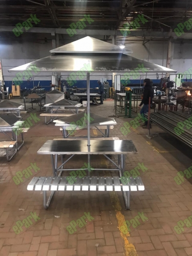 MESA PICNIC KIOSCO MOD.MP-EPARKTECH ACERO INOXIDABLE Y ALUMINIO CON SOMBRILLA, PRODUCTO NUEVO