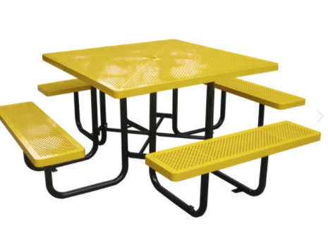 MESA PÍCNIC CUADRADA FABRICADA CON ACERO, MALLA ROMBO O LÁMINA PERFORADA, MEDIDA SUPERFICIE DE LA MESA 1.20 M ASIENTOS Y RESPALDO TAMBIÉN FABRICADOS CON ÁNGULO Y MALLA ROMBO O LÁMINA PERFORADA,