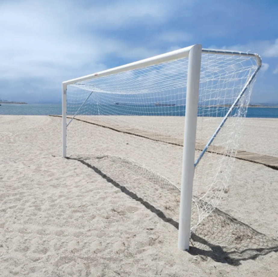 Porterías de medidas interiores de  5,50 x 2,20mts que se fijan al suelo mediante el hormigonado de unos botes de 50 cm. o enviando los postes 87 cm. más largos para poder enterrarlos directamente en la arena (indicar la opción deseada). Incluyen: marco de postes y larguero de aluminio, escuadras interiores metálicas para unión poste larguero, botes y pieza de unión para empotrarla en el suelo, ganchos  de poliamida  para sujetar la red en la parte trasera del marco, arquillos metálicos traseros por donde desciende la red. Color blanco.