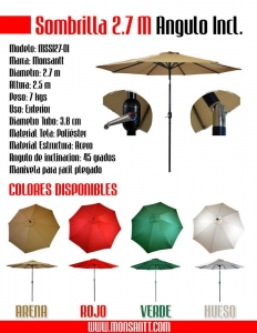 2.76 mts de diámetro. Fabricada en ALUMINIO y poliéster. Sistema de apertura con palanca. Garantía de 1 año en estructura y tela.precio no incluye base