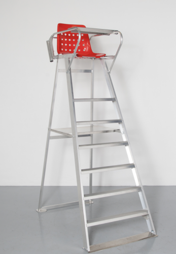 SILLA PARA JUEZ FABRICADA CON ALUMINIO 100%. LIGERA PESO TOTAL 20 KG, ASIENTO ESTADIO, ESCALERA CON ANTIDERRAPANTE, ALTURA TOTA SILLA 2 M DE ALTURA ANCHO 50 CM, PREPARACIÓN PARA COLOCAR SOMBRILLA