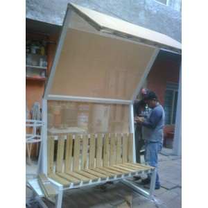Banca Doble, con Mesa y toldo rayado, medidas2.0 m largo,. 1.10 m de ancho, altura 2.20 m fabricada en estructura de acero, pintada del color a las necesidades del cliente, madera