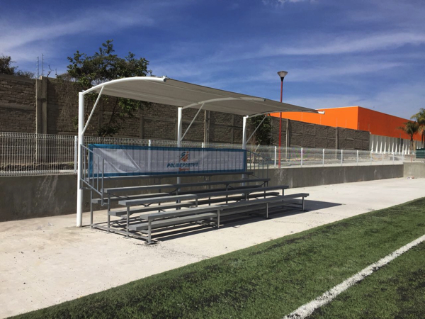 Se instalaron las gradas para el campo deportivo cadereyta Gradas de acero, de 15m, con barandal sencillo y dos escaleras techo de malla sombra