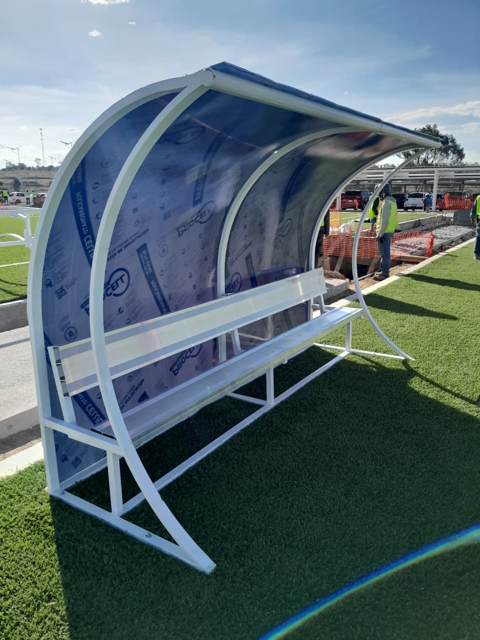 INSTALACION DE BANCAS PARA JUGADORES MEDIDA 4 M DE LARGO X 1.80 M DE ALTURA, ASIENTO Y RESPALDO DE ALUMINIO POLICARBONATO CELULAR 6 MM
