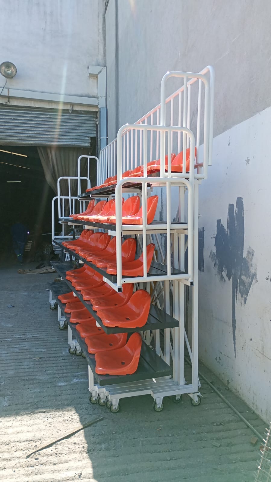 INSTALACIÓN DE 6 GRADAS DE ALUMINIO COLOR NARANJA, Y ASIENTOS DE ESTADIO