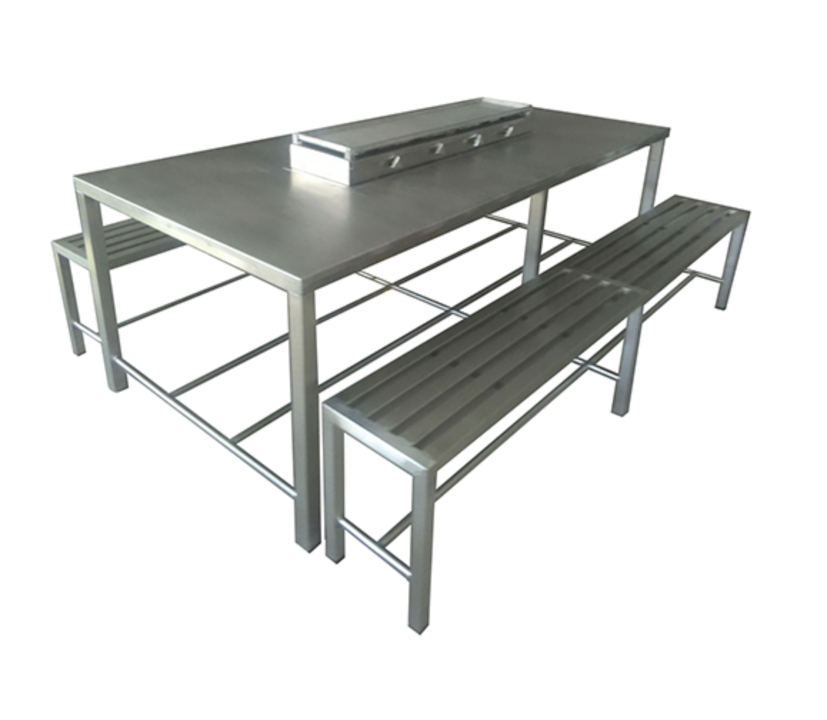 Mesa para comedor de inoxidable medida 1.80 m x 1.44 m. incluye dos bancas laterales