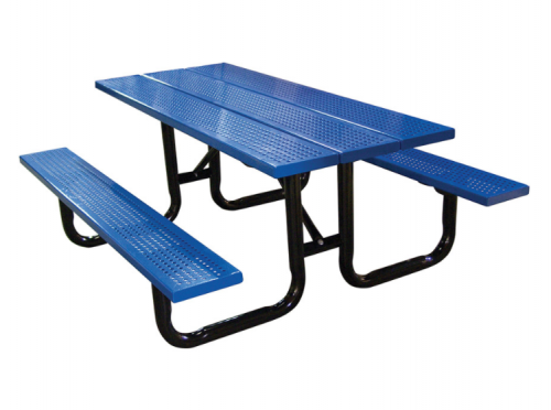 Mesa pícnic fabricada en acero, tablones de lamina perforada de 25 cm y tubo de 1.5 pulgadas calibré 14, altura de la mesa 74 en, largo de la mesa es